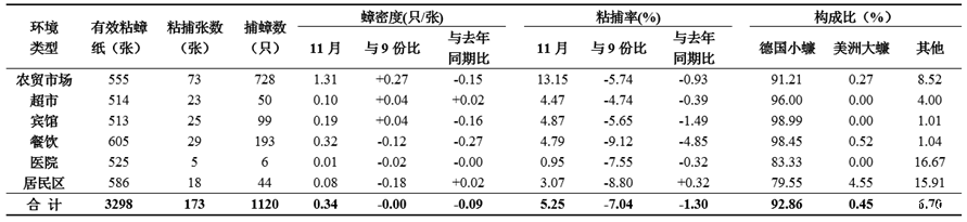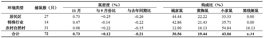 11月全省开展了鼠、蟑2项密度监测。监测结果显示:11月夹夜法监测鼠密度平均为0.73%,较9月(0.61%)上升了19.67%,较去年同期(0.94%)下降了22.34%。11月粘捕法监测蟑密度平均为0.34只/张,与9月(0.34只/张)持平,较去年同期(0.43只/张)下降了20.93%;平均蟑粘捕率为5.25%,较9月(12.29%)下降了57.28%,较去年同期(6.55%)下降了19.85%。
