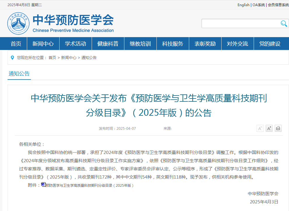 2025年4月7日,中华预防医学会官网发布了《预防医学与卫生学高质量科技期刊分级目录》(2025年版),我刊《公共卫生与预防医学》首次入选《预防医学与卫生学高质量科技期刊分级目录》。